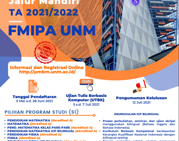 Penerimaan mahasiswa baru jalur mandiri Universitas Negeri Makassar Tahun Ajaran 2021/2022 telah dibuka. Tersedia jalur prestasi (bidang Sains, Olahraga, seni dan/atau Hafidz) dan jalur Ujian Tulis Berbasis Komputer (UTBK). Registrasi pendaftaran dimulai pada tanggal 5 mei sampai dengan 28 Juni 2021. Proses pendaftaran dilakukan secara...Read More