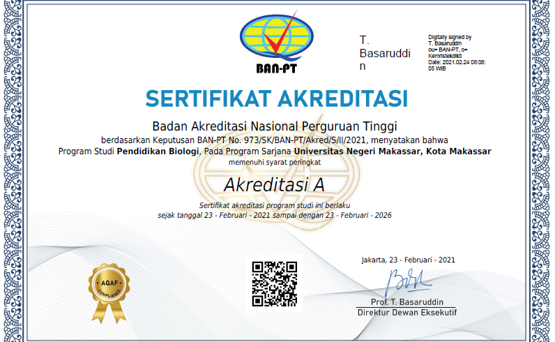 Jurusan Biologi – Program Studi Pendidikan Biologi FMIPA UNM berhasil meraih Akreditasi dari BAN-PT. Hasil akreditasi ini resmi diumumkan pada tanggal 23 Februari 2020. Sebelumnya, Program Studi Pendidikan Biologi FMIPA UNM melaksanakan assesmen lapangan pada tanggal 15-16 Februari 2021. Tim asesor BAN-PT yang bertugas dalam...Read More