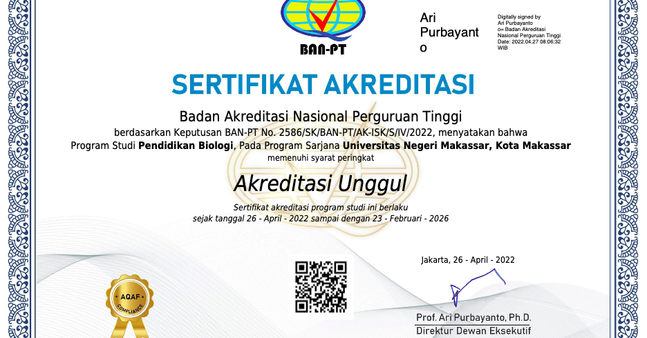 Jurusan Biologi- Program studi Pendidikan Biologi mendapatkan predikat Unggul dari Badan Akreditasi Nasional Perguruan Tinggi. Hal ini tertuang dalam surat keputusan yang diterbitkan oleh BAN-PT dengan nomor 2586/SK/BAN-PT/AK-ISK/S/IV/2022 tentang konversi peringkat akreditasi Program Studi Pendidikan Biologi pada program sarjana Universitas Negeri Makassar. Masa berlaku predikat unggul...Read More